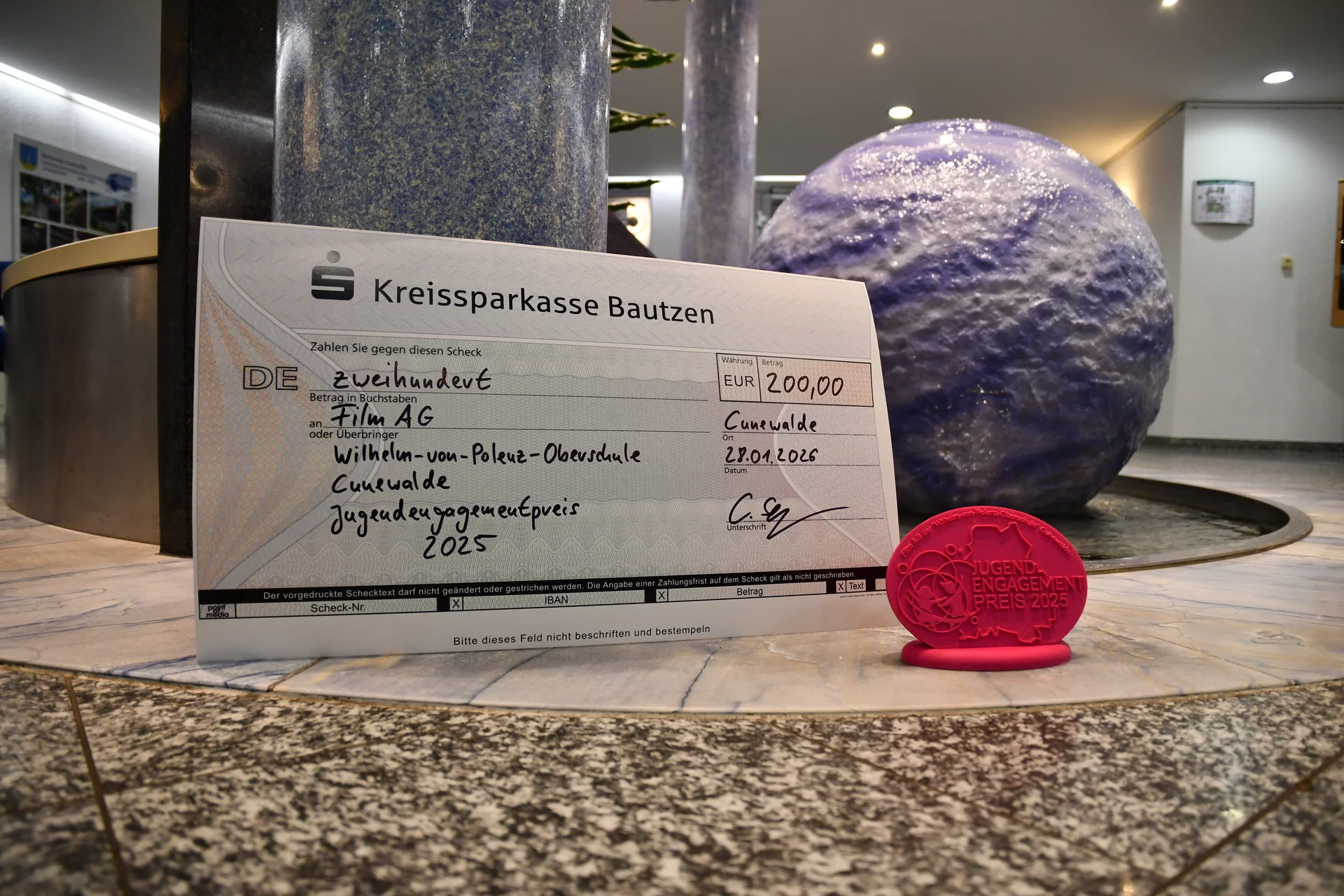 Die Film-AG der Wilhelm-von-Polenz-Oberschule Cunewalde gewinnt als eine von 10 Initiativen den Jugendengagementpreis im Landkreis Bautzen. Die feierliche Preisverleihung fand am 28. Januar 2026 natürlich in der „Blauen Kugel“ statt.