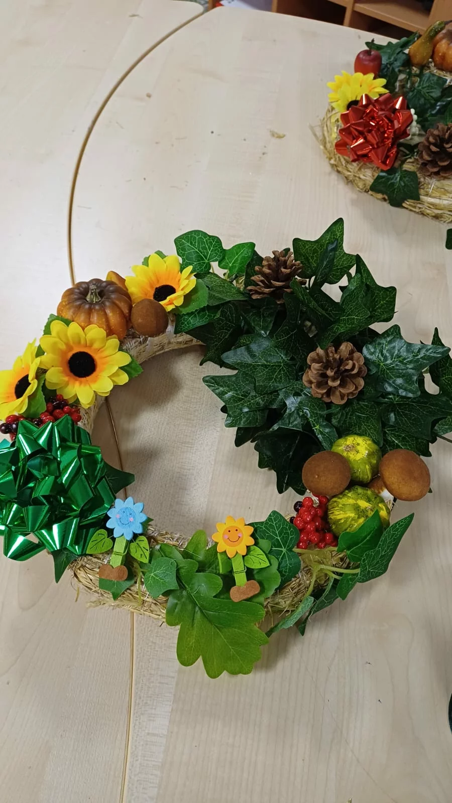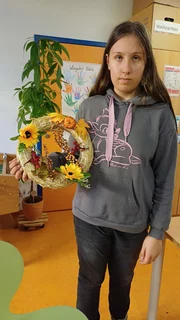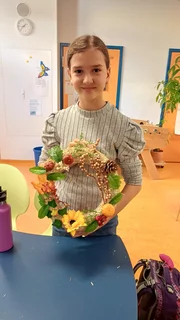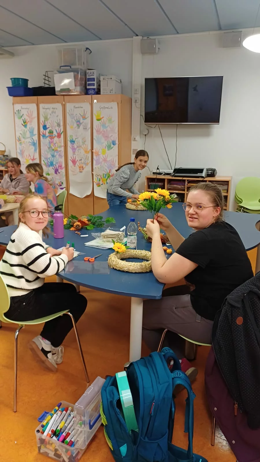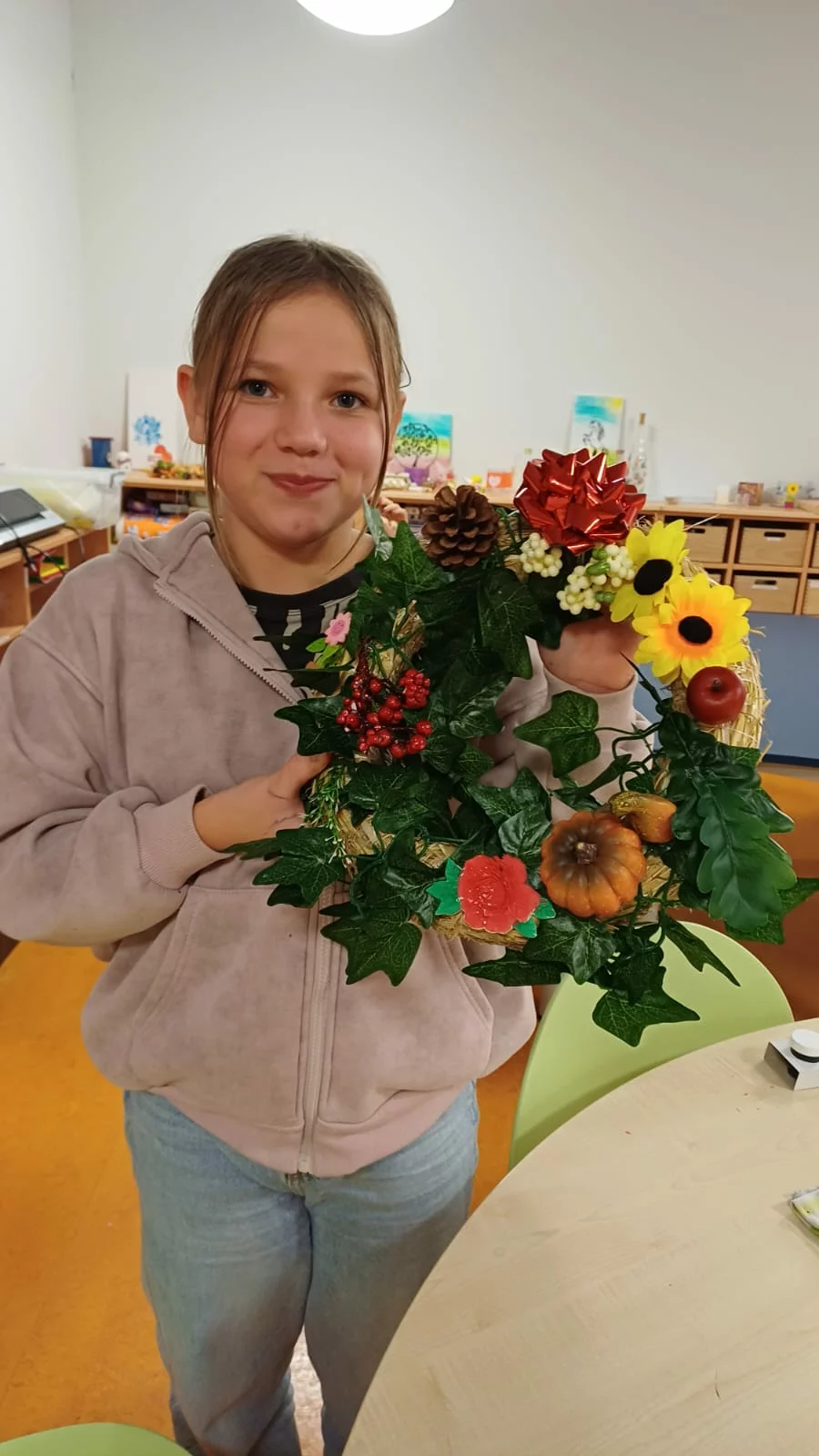Einmal im Monat findet im Schulclub ein zusätzliches Nachmittagsangebot statt. Im Oktober 2025 war es das Herbstbasteln. Unter Anleitung der Clubleiterin Frau Kiehne gestalteten 12 Kinder und Jugendliche kreativen Herbstschmuck wie Türkränze und bedruckten Beutel mit Herbstblättern. Dabei entstanden großartige Kunstwerke, wie man auf den Bildern sehen kann.