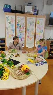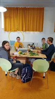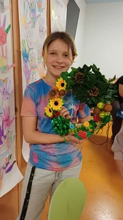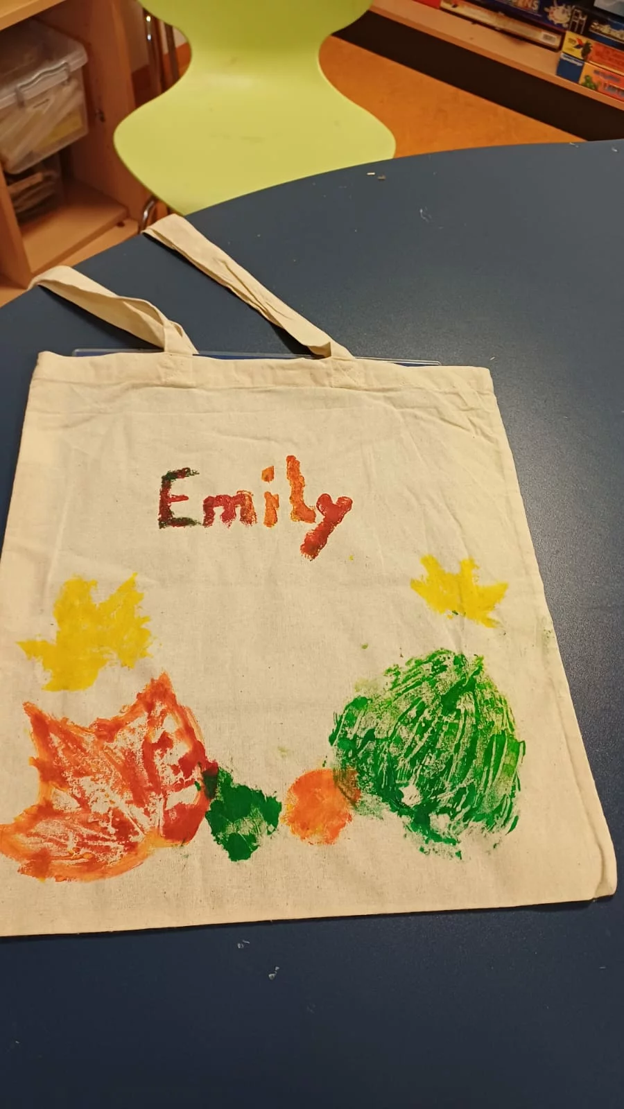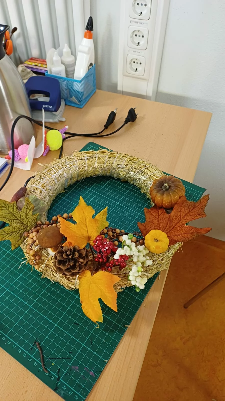 Einmal im Monat findet im Schulclub ein zusätzliches Nachmittagsangebot statt. Im Oktober 2025 war es das Herbstbasteln. Unter Anleitung der Clubleiterin Frau Kiehne gestalteten 12 Kinder und Jugendliche kreativen Herbstschmuck wie Türkränze und bedruckten Beutel mit Herbstblättern. Dabei entstanden großartige Kunstwerke, wie man auf den Bildern sehen kann.