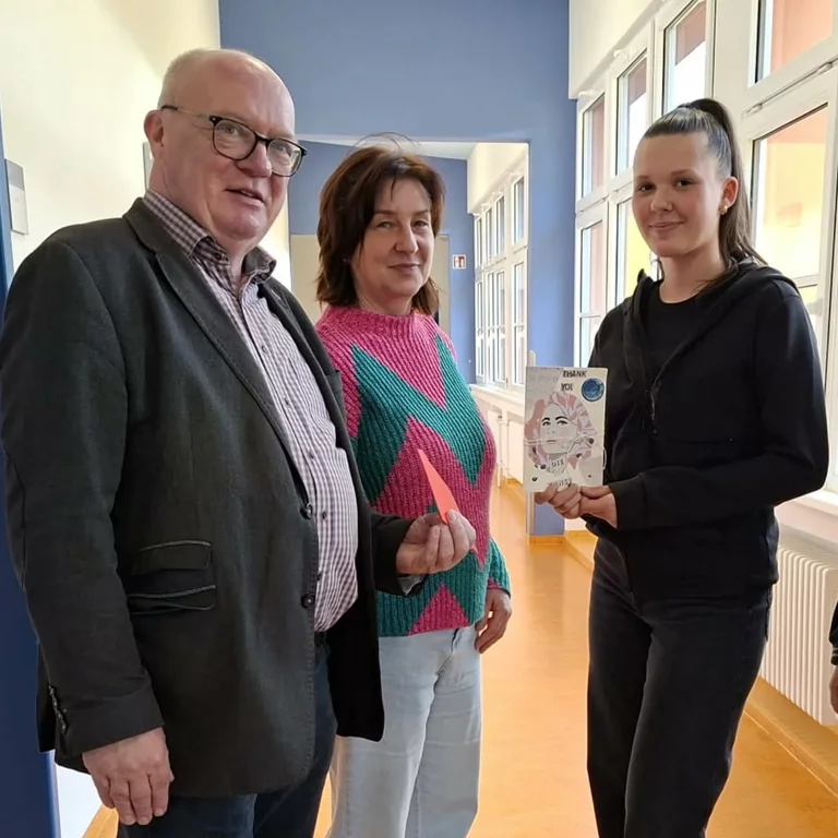 Letzte Woche besuchten uns Bürgermeister Herr Martolock und Frau Zimmermann der Gemeinde Cunewalde in der Schule und überreichten der Theatergruppe der "Wilhelm-von-Polenz-Oberschule" eine Spende in Höhe von 200 Euro für ihre Verdienste und Auftritte in der Blauen Kugel sowie in der Gemeinde. Die Schülersprecherin Flora Sturies aus Klasse 9, gleichzeitig aktive Schauspielerin in der Theater AG, nahm das Geld entgegen. Herzlichen Dank für diese Wertschätzung, die unseren jungen Menschen immer wieder entgegengebracht wird.