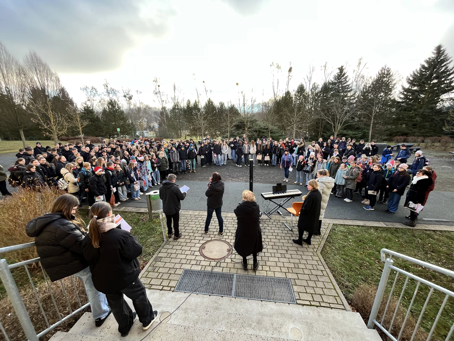 Bevor der Tag endete und die Weihnachtsferien offiziell eingeläutet wurden, sang die gesamte Oberschule gemeinsam zwei Weihnachtslieder – musikalisch begleitet von Frau Straube am Klavier sowie Frau Heroldund Frau Fiebiger am Mikrofon. Ein bewegender und feierlicher Moment, der das Gemeinschaftsgefühl noch einmal besonders stärkte.